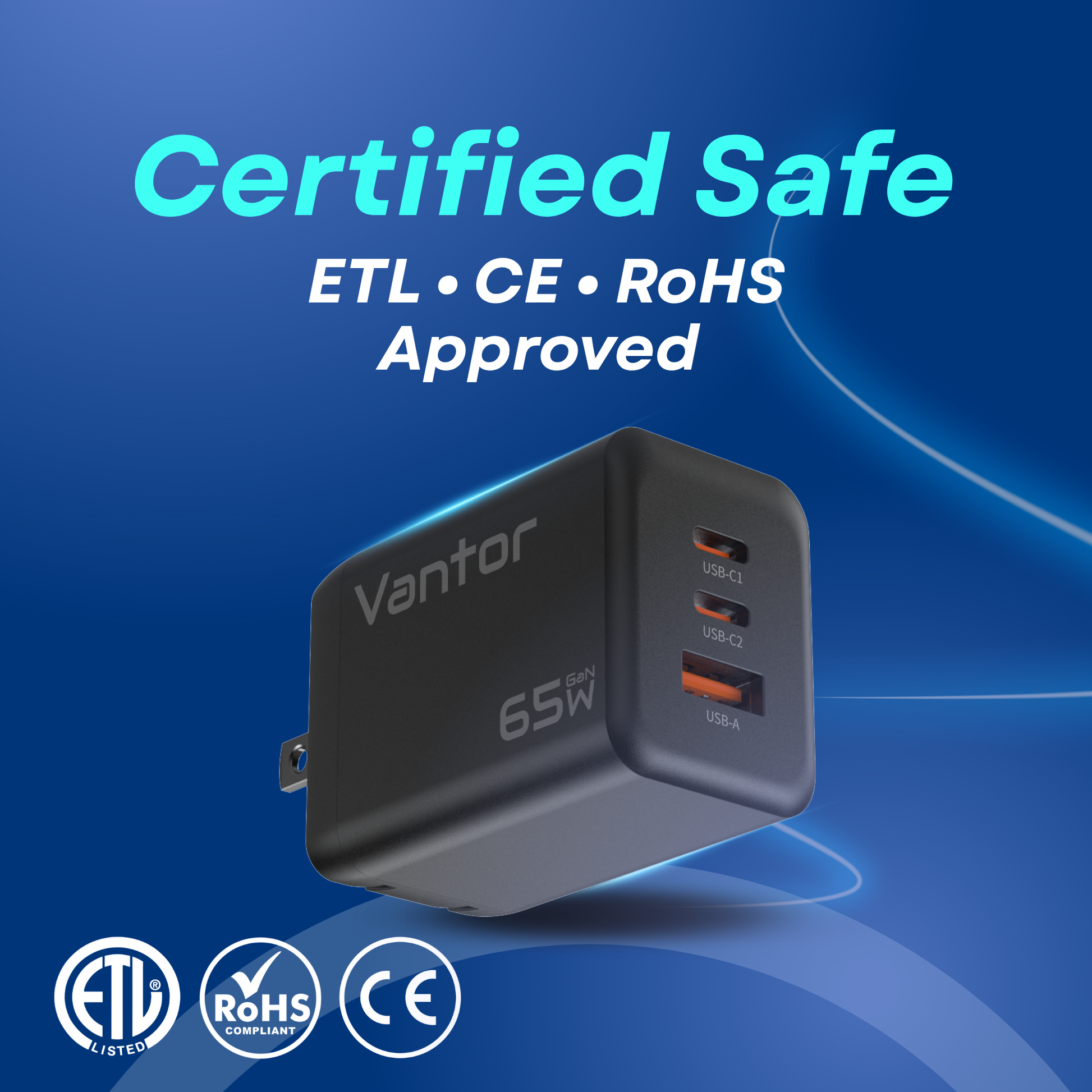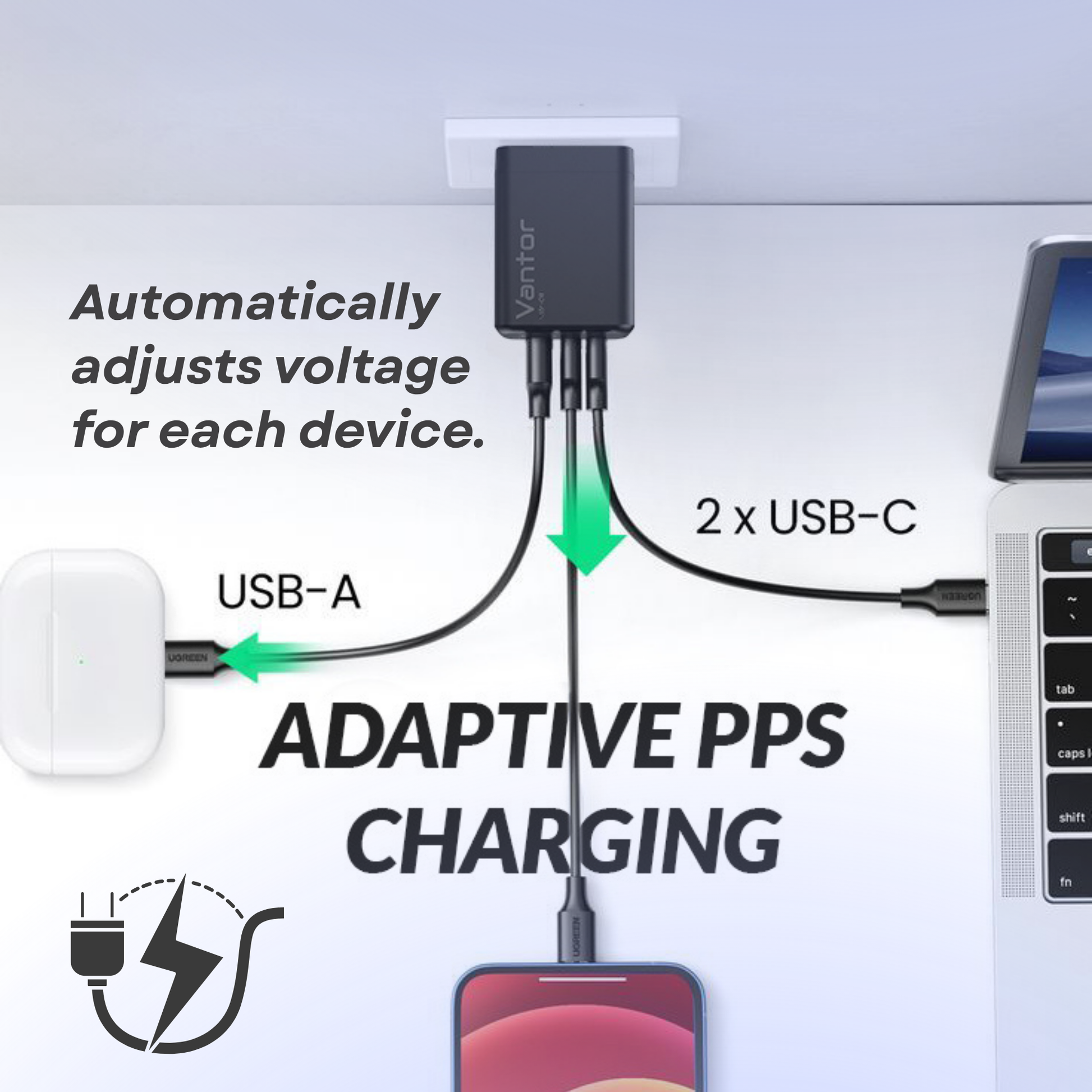 The VANTOR 65W GaN Fast Charger is designed to power your devices faster and smarter. Using advanced Gallium Nitride technology, it delivers high performance in a compact size. With two USB-C ports and one USB-A port, you can charge multiple devices at the same time without sacrificing speed. PPS and PD support make it ideal for laptops, smartphones, tablets, and gaming devices. Safety features protect against over-voltage, over-current, and overheating, making it the perfect all-in-one charger for travel, home, and office.